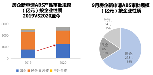 今年至今,國資房企新申請ABS產(chǎn)品總規(guī)模達(dá)1265億,同比大漲123%,已是去年全年申請總規(guī)模1.6倍。國企已逐漸超過民企成為房企資產(chǎn)證券化融資主力!叭龡l紅線“出臺后的九月,截至9月29日,國資房企9月新申請ABS項目總規(guī)模超200億,占比超6成。