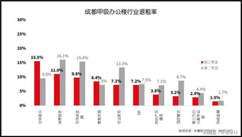 疫情沖擊各行各業(yè),除與風(fēng)險存在對沖關(guān)系的醫(yī)藥、科技互聯(lián)網(wǎng)等行業(yè)外,諸多企業(yè)生存壓力增大,優(yōu)勝劣汰加劇。自3月起,全行業(yè)退租現(xiàn)象頻繁,上半年非傳統(tǒng)金融業(yè)退租率更是高達(dá)24.4%。進(jìn)入三季度后,成都市場退租現(xiàn)象開始放緩,總退租面積較二季度下降28.5%。而消費(fèi)服務(wù)、文體娛樂、非傳統(tǒng)金融仍為主要退租行業(yè),退租率分別為15.5%、11.0%和9.8%。疫情加速行業(yè)內(nèi)調(diào)整,兼并購以及破產(chǎn)重組事件多發(fā),引致專業(yè)服務(wù)企業(yè)業(yè)務(wù)開始上揚(yáng),其中律師事務(wù)所更是從中獲益,季度內(nèi)錄得其新租面積超1萬平方米。