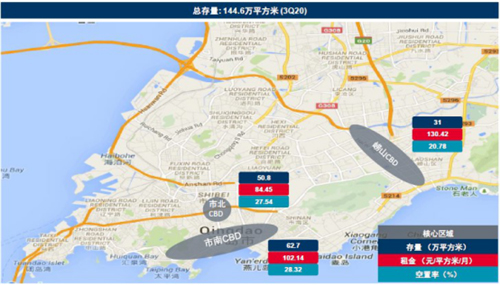 2020年第三季度,青島無新項目入市,甲級寫字樓市場總存量在144.6萬平方米;平均租金為每月105.07元/㎡,環(huán)比下降3.05%,空置率環(huán)比下降2.42個百分點至26.42%,部分寫字樓業(yè)主通過降低租金或補貼的方式來減輕租戶負擔。