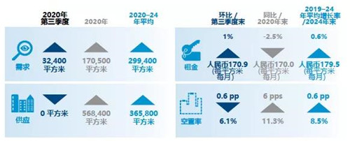有479,400平方米的甲級寫字樓新增面積計劃在2020年第四季度入市,占到全年新增供應(yīng)面積的84%。我們預(yù)期,大量的新增供應(yīng)將為全市的平均租金帶來壓力,但部分新增項目可能延期。如果這些新增寫字樓項目都能如期交付,全市空置率將會升至11.3%。