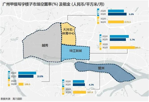 2020年第三季度,由于無新增供應(yīng)入市,可租賃的面積較少,一些今年約滿、對物業(yè)要求較高的租戶多選擇遷入珠江新城。而其他對租金較為敏感的租戶則選擇了在天河或者海珠的產(chǎn)業(yè)園。