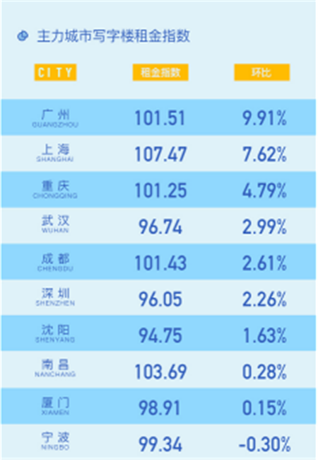 據(jù)58同城、安居客《2020年Q3三十城寫字樓租賃指數(shù)報告》顯示,三季度商業(yè)地產(chǎn)下行壓力仍然存在,租金指數(shù)為94.04,季度環(huán)比下跌1.69%,雖然整體寫字樓租金仍呈下行趨勢,但跌幅收窄。廣州、上海、重慶等9城市的寫宇樓租金指數(shù)上揚(yáng),其中廣州寫字樓掛牌租金環(huán)比上漲9.91%,一線城市帶頭復(fù)蘇。上海、南昌等六個城市租金指數(shù)已超去年四季度,市場正在逐步脫離疫情影響。
