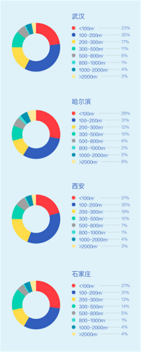 58安居客房產(chǎn)研究院還對用戶找房偏好進(jìn)行了分析,在寫字樓租賃活躍城市找房面積分布方面,武漢、哈爾濱、西安和石家莊整體最受用戶關(guān)注的是100㎡以下及100-200㎡的辦公空間,可見小區(qū)域辦公空間仍為當(dāng)下用戶的不二之選。