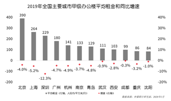 2018年,重慶辦公樓市場迎來第三方辦公新增供應(yīng),近19萬平方米新增供應(yīng)投入二級租賃市場。次年集中供應(yīng)引致競爭加劇,二級租賃市場步入存量時代,部分品牌承壓退出重慶市場,市場呈現(xiàn)兩極分化。仲量聯(lián)行數(shù)據(jù)顯示,2019年第四季度重慶二級租賃市場整體轉(zhuǎn)租率達到86.8%,環(huán)比回落2.9個百分點。但市場仍錄得部分運營商持續(xù)在渝擴張,第四季度德事商務(wù)中心進駐大都會商廈,凱德置地在來福士辦公樓A座推出自營聯(lián)合辦公品牌奕橋。二級租賃市場點燃的“價格戰(zhàn)”傳導至一級市場,迫使全市大多數(shù)業(yè)主降租以避免租戶流失。統(tǒng)計層面,2019年,重慶甲級辦公樓租金同口徑同比下跌3.3%,報86.1元/平方米/月,以價換量乃大勢所趨。