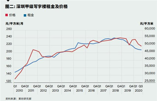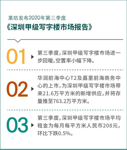 經(jīng)濟(jì)的向好發(fā)展也帶動(dòng)了深圳甲級(jí)寫字樓市場的進(jìn)一步復(fù)蘇,寫字樓市場進(jìn)一步去化。2020年第三季度,深圳甲級(jí)寫字樓市場的空置率環(huán)比小幅下跌0.3個(gè)百分點(diǎn)至18.4%,跌幅環(huán)比收窄0.5個(gè)百分點(diǎn)。受空置率依然高企的影響,深圳甲級(jí)寫字樓市場平均租金環(huán)比下跌0.5%至每月每平方米人民幣208元。租金的下跌趨勢也促進(jìn)了優(yōu)質(zhì)企業(yè),尤其是專業(yè)服務(wù)類及T M T類企業(yè),積極尋求搬遷或擴(kuò)張的機(jī)會(huì)!