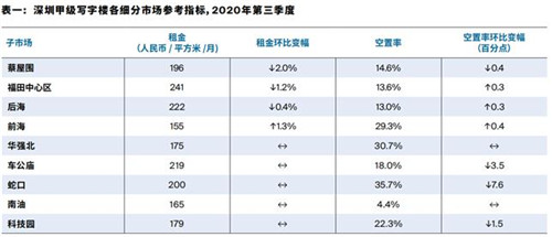 2020年第三季度,華潤前海中心T2及嘉里前海商務(wù)中心交付上市,帶來21.6萬平方米的新增供應(yīng)。深圳甲級(jí)寫字樓市場存量上升至763.2萬平方米,凈吸納量為19.8萬平方米。