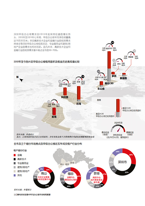 順應(yīng)城市的建設(shè)軌跡,深圳辦公樓市場也經(jīng)歷了二十多年的飛躍發(fā)展。近十年間,深圳辦公樓市場多處于供需兩旺的狀態(tài),從2015年開始迎來了爆發(fā)式增長,截至2020年二季度,甲級辦公樓存量已經(jīng)達到2000年年底存量的30倍以上。而需求方面,近幾年來,高新技術(shù)產(chǎn)業(yè)和金融業(yè)發(fā)展勢頭迅猛,來自這兩個行業(yè)的租賃需求基本占全市的50-70%。