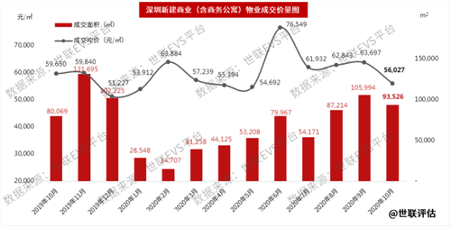 10月份深圳存量商業(yè)物業(yè)(以商務(wù)公寓為主)交易不活躍,成交面積25,113平方米(僅為一手成交量的27%),環(huán)比下降22.5%。