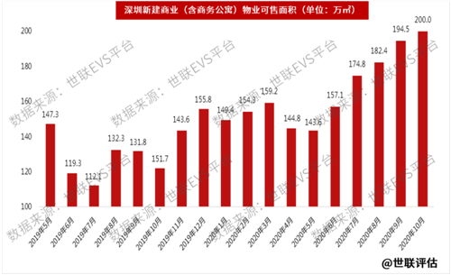 10月份,深圳新建商業(yè)物業(yè)(以商務(wù)公寓為主)可售面積為200.0萬平方米,環(huán)比上升2.8%,連續(xù)5個月上揚,再創(chuàng)近期新高。本指標顯示庫存壓力依然較大。