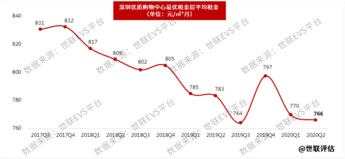 第二季度,深圳主要商圈優(yōu)質(zhì)購物中心最優(yōu)租金層平均租金下跌至766元/㎡·月,空置率顯著上升至4.5%。各大購物中心客流和銷售額有所恢復(fù),高端消費仍維持低迷態(tài)勢,業(yè)主以價換量減少租戶流失。