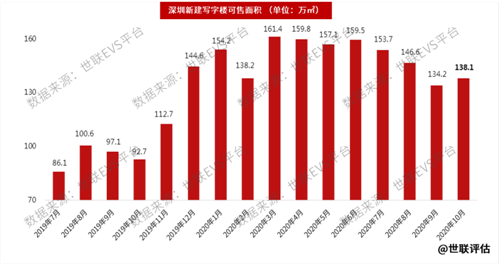 10月份,深圳新建寫字樓可售面積為138.1萬平方米,庫存量上升2.9%,總體呈趨勢性下降形態(tài)。新建寫字樓庫存去化周期為43.2個月,本指標顯示庫存壓力依然巨大。
