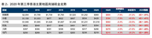 在空置率壓力下,租金也連續(xù)第六個(gè)季度下跌,沒有區(qū)域例外,中區(qū)及灣仔/銅鑼灣區(qū)跌幅最大,環(huán)比分別下跌6.3%及5.2%,同比分別下跌16.9%及15.0%,預(yù)計(jì)全年跌幅可分別達(dá)25%及23%。