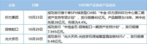 10月,據(jù)觀點(diǎn)指數(shù)不完全統(tǒng)計(jì),商業(yè)地產(chǎn)資產(chǎn)證券化產(chǎn)品共發(fā)行3單,發(fā)行總額為54.43億元,較上月的9單127.63億元明顯大幅下降。其中最大額為印力發(fā)行的首個(gè)單SPV續(xù)發(fā)型CMBS,發(fā)行規(guī)模40億元,產(chǎn)品期限為18年,其中優(yōu)先級(jí)38億元,利率為4.4%,標(biāo)的物業(yè)為深圳印力中心。