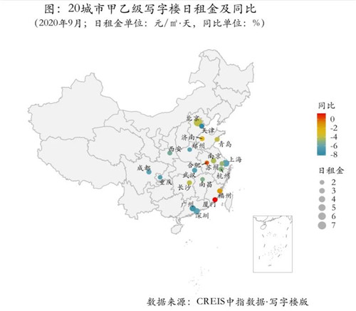 盡管受疫情基本得到控制、經(jīng)濟(jì)逐步復(fù)蘇、企業(yè)復(fù)工復(fù)產(chǎn)多重利好因素影響,三季度寫字樓市場的下行趨勢并未完全扭轉(zhuǎn),但是多城市租金降幅有所收窄。從租金報(bào)價(jià)來看,20城市寫字樓租金仍處于下行通道但整體企穩(wěn),平均租金為2.76元/㎡·天,租金小幅下跌且跌幅明顯收窄并趨于穩(wěn)定,空置率受新增供應(yīng)影響小幅上升。
