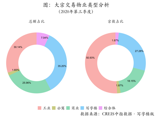 從大宗交易物業(yè)類型的交易總額來看,寫字樓占比超過三分之一,表明寫字樓依然最受機(jī)構(gòu)投資者青睞,工業(yè)物業(yè)占比超三成,商業(yè)零售類物業(yè)成交約占26%,其余為綜合體和公寓,占比合計(jì)為9%左右。