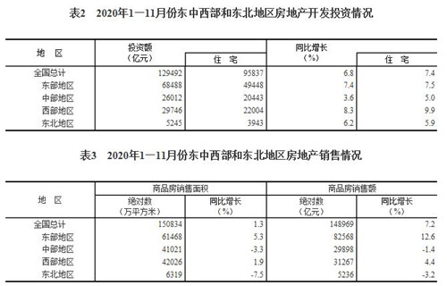 1—11月份,東部地區(qū)房地產(chǎn)開發(fā)投資68488億元,同比增長7.4%,增速比1—10月份提高0.3個(gè)百分點(diǎn);中部地區(qū)投資26012億元,增長3.6%,增速提高1.2個(gè)百分點(diǎn);西部地區(qū)投資29746億元,增長8.3%,增速持平;東北地區(qū)投資5245億元,增長6.2%,增速提高0.6個(gè)百分點(diǎn)。
