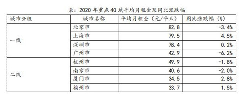 據(jù)貝殼研究院數(shù)據(jù),2020年全國重點40城平均月租金為37.8元/平米,同比下降9.9%。一、二線城市同比降幅均達(dá)4.0%,三線城市同比下降1.5%。上半年的疫情對大部分企業(yè)以及各類商戶產(chǎn)生了沖擊,致使原先應(yīng)返城的流動人口減少,而一、二線城市的租賃需求中外來流動人口占比更高,住房租金下降幅度較大。