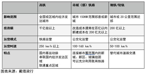 市域鐵路作為介于高鐵與地鐵之間,適宜輻射范圍在都市圈100公里范圍內(nèi)的軌道交通形式,在充分利用既有鐵路設(shè)施帶來的相對低成本前提下,形成了在造價(jià)、運(yùn)營時(shí)速與輻射范圍間的平衡優(yōu)勢。