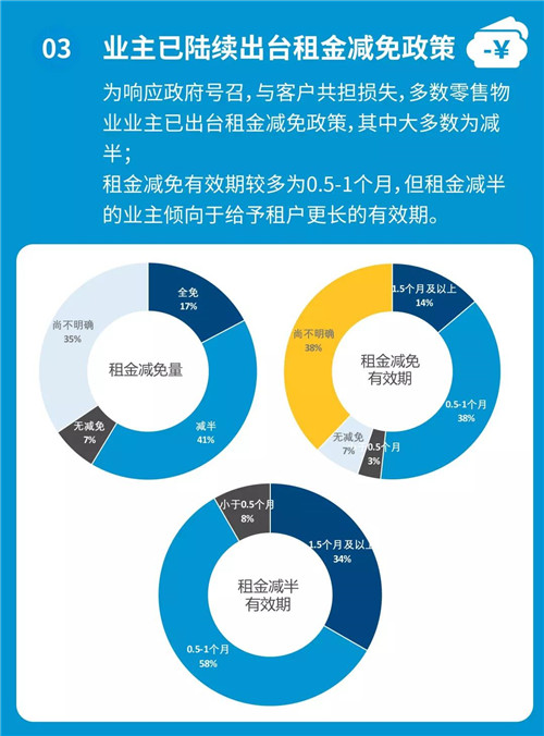 2、為共同應(yīng)對(duì)疫情,約六成零售物業(yè)業(yè)主已發(fā)布了租金減免政策,其中多數(shù)有效期為0.5-1個(gè)月。