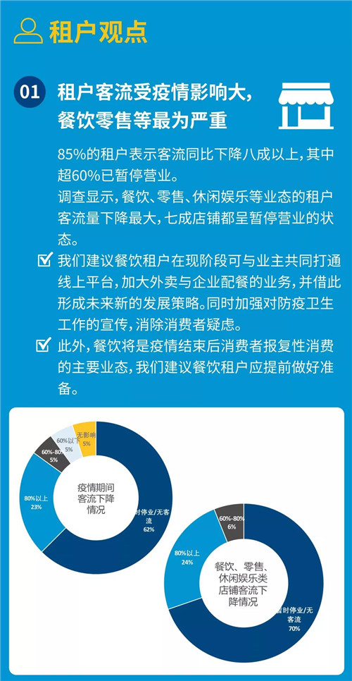 5、餐飲企業(yè)租戶在本次疫情中受創(chuàng)嚴(yán)重,尤其大型連鎖餐飲。我們建議餐飲租戶在當(dāng)下可與業(yè)主共同打通線上平臺(tái),加大外賣與企業(yè)配餐的業(yè)務(wù),并借此形成未來(lái)新的發(fā)展策略。同時(shí)加強(qiáng)對(duì)防疫衛(wèi)生工作的宣傳,消除消費(fèi)者疑慮。此外,餐飲將是疫情結(jié)束后消費(fèi)者報(bào)復(fù)性消費(fèi)的主要業(yè)態(tài),我們建議餐飲租戶應(yīng)提前做好準(zhǔn)備。