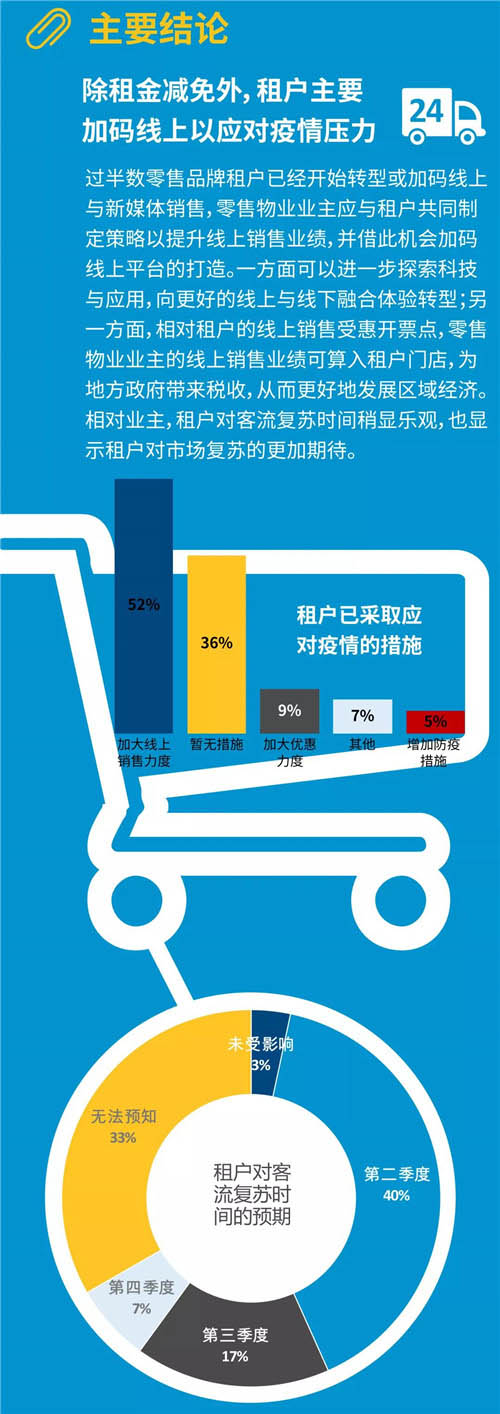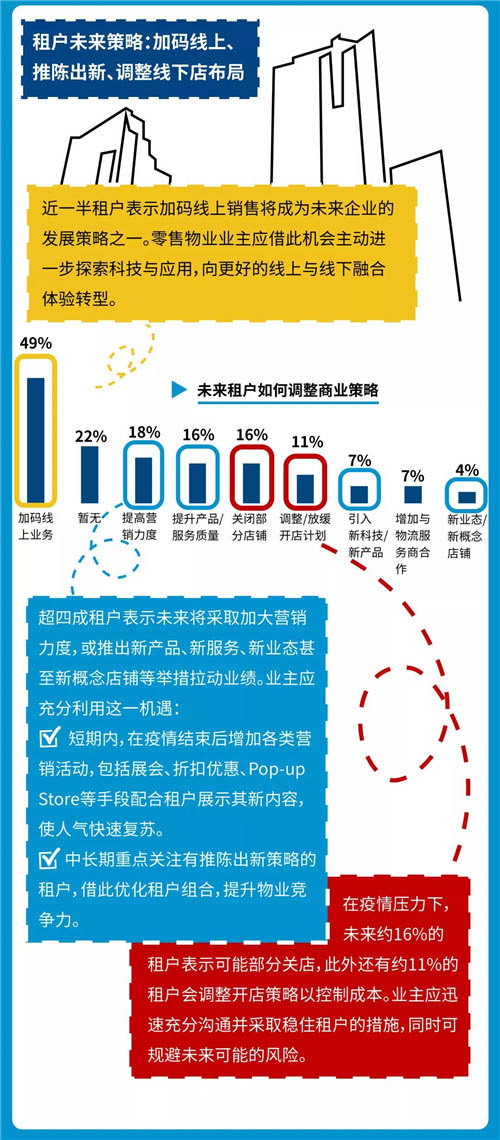 1、在疫情壓力下,未來(lái)約16%的租戶表示可能部分關(guān)店,此外還有約11%的租戶會(huì)調(diào)整開(kāi)店策略以控制成本。業(yè)主應(yīng)迅速充分溝通并采取穩(wěn)住租戶的措施,同時(shí)可規(guī)避未來(lái)可能的風(fēng)險(xiǎn)。