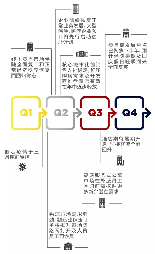 "住宅:伴隨預(yù)售證發(fā)放,以及積壓的購房需求陸續(xù)釋放,核心城市有望于年中開始逐步回暖;但高端租賃市場恢復(fù)需更多時日。