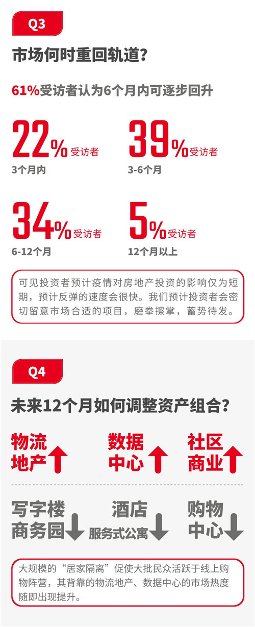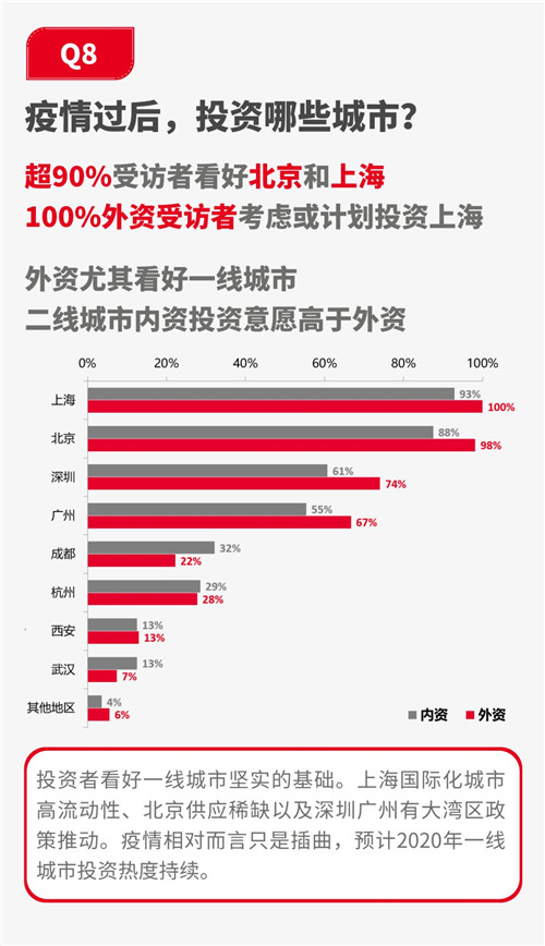 從調(diào)研結(jié)果來看,市場信心還是比較充足。超60%的受訪者認(rèn)為投資活動將在疫情結(jié)束后6個月內(nèi)得到反彈。并有99%的受訪者表示疫情過后依然會投資國內(nèi)。城市方面,投資者對一線城市熱情更為高昂,其中尤以外資為甚,100%外資受訪者均表示未來12個月內(nèi)有投資上海的計劃。