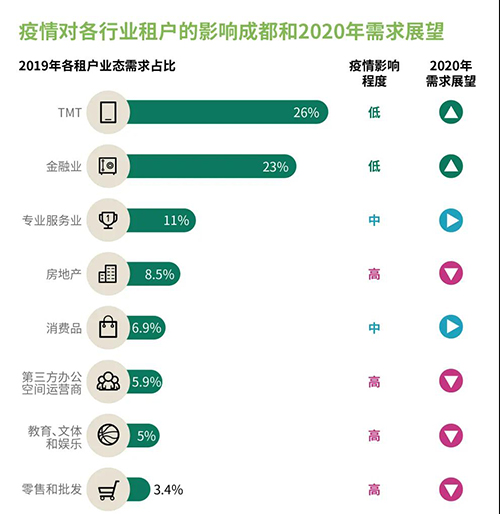 疫情對(duì)主力需求行業(yè)沖擊較小:受疫情影響最大的行業(yè),如酒店業(yè)、餐飲業(yè)、運(yùn)輸業(yè)和零售業(yè)的企業(yè)辦公需求可能會(huì)受到重創(chuàng)。然而,我們的分析表明,疫情對(duì)主要需求驅(qū)動(dòng)行業(yè)(TMT、金融業(yè)和專業(yè)服務(wù)業(yè))的影響較小,甚至可能刺激某些科技類企業(yè)的辦公租賃需求的加速增長(zhǎng),如在線游戲和教育、企業(yè)在線辦公服務(wù)等。