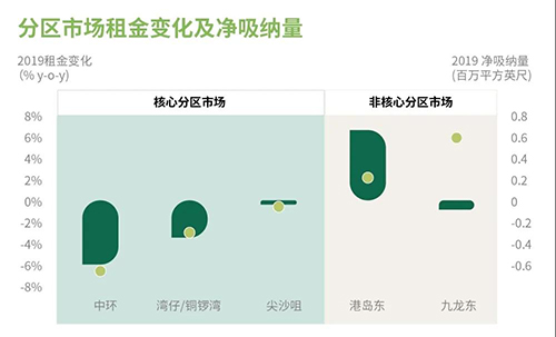 疲弱的租賃需求促致市場(chǎng)上的可租用空間上升。核心分區(qū)市場(chǎng)的空置率全都攀升,其中中環(huán)的空置率從2018年底的1.3%升至2019年底的3.4%,是自2014年以來最高的年末值。因此,該分區(qū)市場(chǎng)的租金同比下降了5.9%,是自2012年以來的年度最大跌幅。