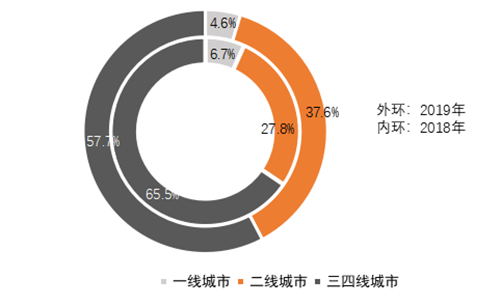 2019年,商業(yè)地產(chǎn)百強代表企業(yè)平均新增商辦用地規(guī)劃建筑面積為78.8萬平方米,同比上升18%,投資有所增長。2019年城市布局中,百強代表企業(yè)在一線城市的土儲規(guī)模占比縮減至4.6%;二線城市新增商辦用地占比增長至37.6%,較上年提高9.8個百分點;三四線城市占比為57.7%,但占比較上年有所回落。