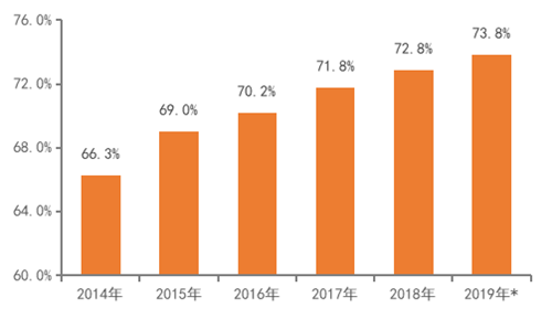 2019年商業(yè)地產(chǎn)百強代表企業(yè)的資產(chǎn)負債率均值上升至73.8%,較2018年提高1.0個百分點。盡管自2014年至今,商業(yè)地產(chǎn)百強代表企業(yè)的資產(chǎn)負債率呈持續(xù)上升態(tài)勢,但商業(yè)地產(chǎn)企業(yè)的資產(chǎn)負債率尚在可控范圍內(nèi)。代表企業(yè)以較穩(wěn)定的租金收入作為經(jīng)營保障,整體仍保持穩(wěn)健運行。