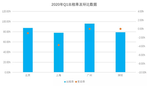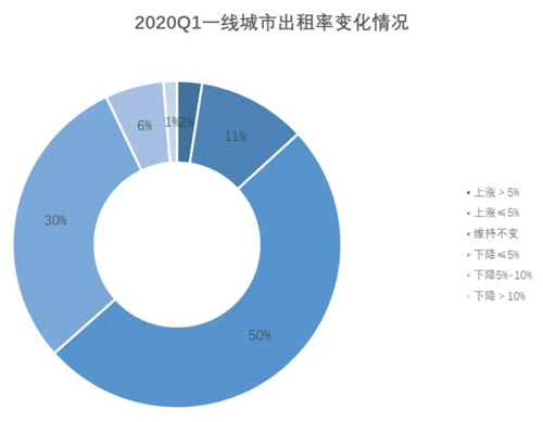 2020年一季度一線城市平均租金降幅超前5個(gè)季度的租金平均降幅2.1%,達(dá)到2.5%;出租率下跌1.2%,不但高于前5個(gè)季度的出租率平均跌幅0.7%,更是創(chuàng)2019年一季度以來(lái)的最大降幅。