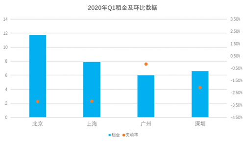 自2018年四季度起,在經(jīng)濟(jì)增速下降和貿(mào)易爭(zhēng)端影響下,一線城市整體市場(chǎng)一直處于下行態(tài)勢(shì),平均出租率和租金均出現(xiàn)連續(xù)6個(gè)季度下跌,新冠疫情的爆發(fā)進(jìn)一步加重這一下跌態(tài)勢(shì)。2020年一季度,一線城市整體出租率、租金雙降,出租率環(huán)比下降1.2%,租金環(huán)比下降2.5%。