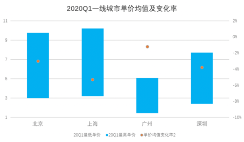 不少非核心區(qū)域新入市項(xiàng)目拉低平均租金;供應(yīng)量增大的同時(shí),需求量在整體經(jīng)濟(jì)增速放緩、中美貿(mào)易戰(zhàn)、新冠疫情等因素影響下減少,導(dǎo)致供需失衡,一線城市平均租金隨之集體下跌,北上深平均租金水平創(chuàng)三年新低。其中北京平均租金最高,接近 12 元/平方米/天;上海次之,在8元/平方米/天左右;廣深平均租金保持在 6-7 元/平方米/天不等。