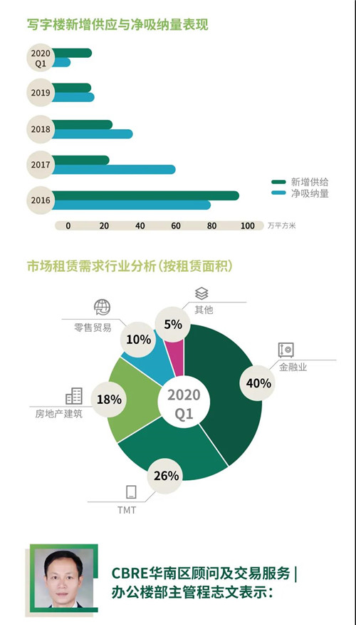 需求方面,金融行業(yè)占全市成交的首位,建設銀行租用天德廣場T2超過2萬平方米,平安人壽保險從非優(yōu)質寫字樓升級到三元里中心,租用超過4,000平方米;其次為TMT和房地產建筑,華為在廣東國際大廈擴張接近1,500平方米;新興彩妝品牌完美日記也在本季錄得2萬平方米琶洲園區(qū)的擴張。
