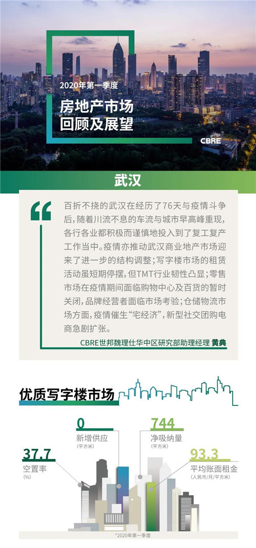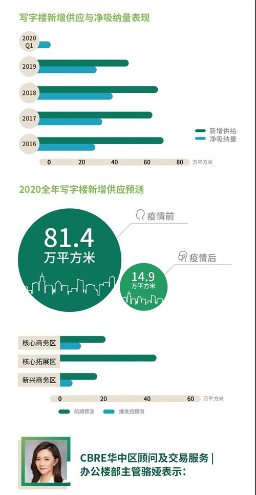 2020年第一季度,武漢寫字樓市場未錄得新增供應(yīng),總存量維持在487萬平方米。