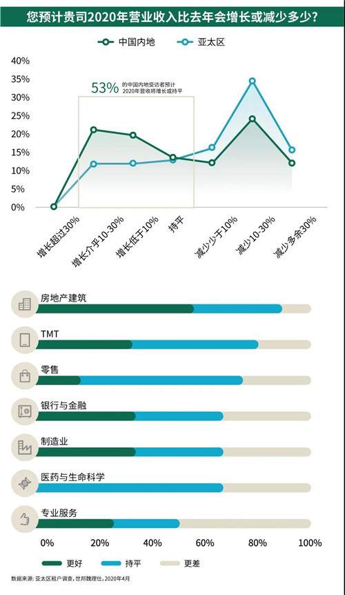 這一結(jié)果與當(dāng)前大多數(shù)在華租戶已經(jīng)復(fù)工且企業(yè)信心隨之逐步恢復(fù)相吻合——約53%的中國(guó)內(nèi)地受訪者預(yù)計(jì),2020年?duì)I收將增長(zhǎng)或持平,其中房地產(chǎn)、科技和電信行業(yè)最為樂(lè)觀。但不容忽視,受疫情影響國(guó)內(nèi)整體經(jīng)濟(jì)環(huán)境仍充滿挑戰(zhàn),仍有約三分之一的受訪者預(yù)計(jì)營(yíng)收將出現(xiàn)兩位數(shù)的下降。