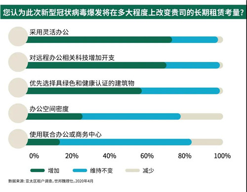長(zhǎng)遠(yuǎn)來(lái)看,此次疫情或?qū)⒋偈棺鈶艮k公習(xí)慣發(fā)生變革。約73%的受訪者表示將增加采用靈活辦公的方式。同時(shí),報(bào)告亦顯示,疫情還提高了租戶對(duì)辦公建筑綠色與健康認(rèn)證的意識(shí)。