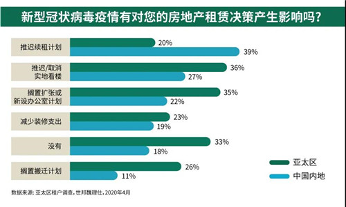 此外,疫情導(dǎo)致中國(guó)內(nèi)地租戶推遲續(xù)租計(jì)劃與實(shí)地看樓。但相較于亞太區(qū)的租戶,中國(guó)內(nèi)地租戶的新設(shè)/擴(kuò)張或搬遷計(jì)劃受影響程度較低。