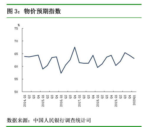 1.物價預(yù)期指數(shù):反映居民對下季物價判斷的擴散指數(shù)。該指數(shù)的計算方法是,先扣除選擇“看不準”的居民數(shù),然后分別計算認為下季物價“上升”與“基本不變”的居民占比,再分別賦予權(quán)重1和0.5后求和得出。