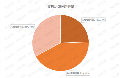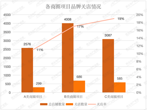 其中A類商圈購物中心平均關(guān)店數(shù)量為33家,關(guān)店率為11%,略高于近年同期數(shù)據(jù),但遠(yuǎn)遠(yuǎn)低于B類商圈C類商圈購物中心的關(guān)店率,值得注意的是,C類商圈項(xiàng)目關(guān)店率出現(xiàn)兩級分化現(xiàn)象,有4家項(xiàng)目關(guān)店率低于8%,但也有3家項(xiàng)目關(guān)店率高于31%。