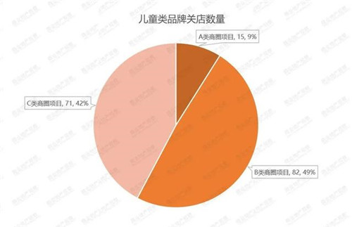 按商圈分布分析,A類商圈內(nèi)商業(yè)項(xiàng)目表現(xiàn)一直穩(wěn)定,9個商業(yè)項(xiàng)目中兒童業(yè)態(tài)的關(guān)店數(shù)量共15家,占比極低;B類和C類商圈內(nèi)商業(yè)項(xiàng)目兒童業(yè)態(tài)關(guān)店數(shù)量基本持平,分別為82家和71家,單個項(xiàng)目最多關(guān)店數(shù)量不超過20家,該業(yè)態(tài)關(guān)店情況平均占比在10%左右。文體娛業(yè)態(tài)關(guān)店總數(shù)為81家,其中A類商圈僅4家,B類50家,C類27家,遠(yuǎn)低于零售、餐飲等業(yè)態(tài)。