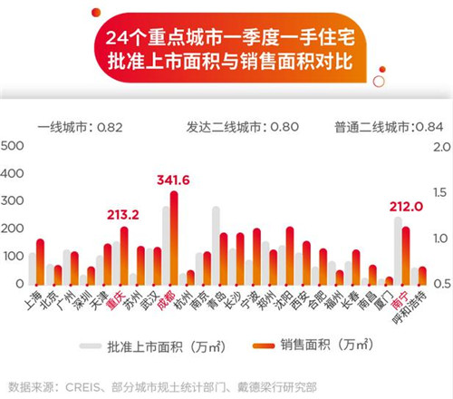 2020年一季度,全國24個(gè)重點(diǎn)城市批準(zhǔn)上市面積同比減少30.6%;銷售面積同比減少31.6% ;供銷比由2019年第4季度的1.05下降到0.82。主要原因在于疫情期間新供應(yīng)不足。