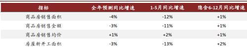 銷售金額角度,綜合上述判斷我們預計全年商品房銷售額同比下降3%(1-5月-11%,隱含6-12月+1%)。