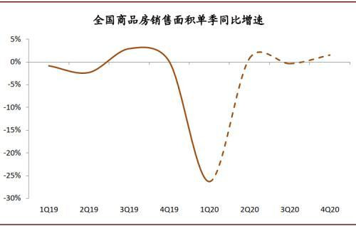 銷售面積下半年整體延續(xù)漲勢,但節(jié)奏回歸季節(jié)性,預計全年同比下跌4%。4月以來伴隨國內疫情得到有效控制,行業(yè)復工復產帶動銷售數(shù)字快速回升,5月統(tǒng)計局銷售數(shù)據(jù)同比轉正(銷售面積/銷售金額分別同比+9.7%/+14%)、6月高頻行業(yè)數(shù)字亦顯示銷售延續(xù)升溫勢頭,二季度我們判斷全國商品房銷售面積將由一季度-26.3%的同比下跌轉為低個位數(shù)增長。往下半年看,我們判斷基本面將由前期復工復產帶動的快速修復回歸至正常季節(jié)性波動,預計三季度銷售同比增速將較二季度有所回落,而四季度可能再次邊際回升,全年預計商品房銷售面積同比跌幅將收窄至4%(1-5月-12%,隱含6-12月同比增長1%)。