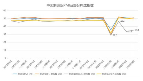 PMI的分指標(biāo)顯示,新出口訂單指數(shù)為35.3%,盡管較4月有所上升,但較正常值仍有相當(dāng)大距離;這也可以看出,3月份46.4%的短期高位,主要源于復(fù)工復(fù)產(chǎn)推進(jìn)后積壓訂單的處理,而當(dāng)積壓訂單處理后,新訂單缺乏,再加上一些原有訂單也在取消,外貿(mào)環(huán)境環(huán)境短期難以改善。