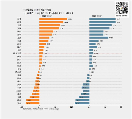 二線城市中,東莞、南通、寧波、無錫四城年度漲幅領(lǐng)先。其中東莞、無錫無論年度漲幅與月度漲幅都居前。2019熱門城市蘇州漲速逐步回落,南京小幅穩(wěn)步上漲。以“萬人搖”而知名的杭州,實際房價相對平穩(wěn),搖號主要是由于一二手房倒掛所致。濟南、青島、天津等仍穩(wěn)中有降。