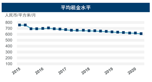 在市場(chǎng)無(wú)新增供應(yīng)的情況下租金略有下降,首層平均租金報(bào)價(jià)環(huán)比下降至每月每平方米人民幣608元。