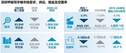 盡管經(jīng)濟(jì)活動重啟,但是深圳甲級寫字樓租金仍然承壓下行,環(huán)比一季度下降5.9個百分點(diǎn),業(yè)主則希望通過充滿吸引力的租金優(yōu)惠和更加靈活的租賃條款來獲取和留存租戶。