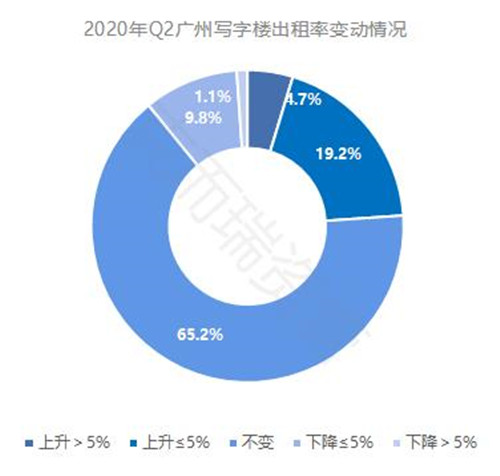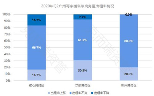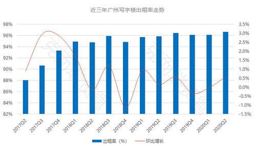 廣州甲級寫字樓出租率 96.7% ,環(huán)比上升 0.6% 。與一季度相比,二季度租賃活動明顯增加,市場逐步從疫情中得到恢復(fù),出租率整體變動不大。